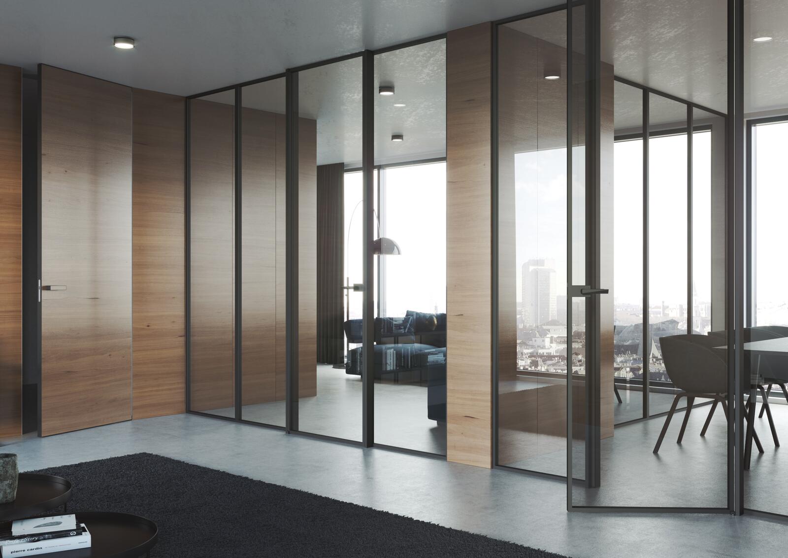 The Garde door frame is made only in versions without door headers and allows combination with fixed sidelights. Can be used in both masonry and drywall partitions. The minimum thickness of the complete partition must be 60 mm. It can be incorporated into any finished construction opening, which requires maximum building accuracy. For installation, the completed floor must already be laid.