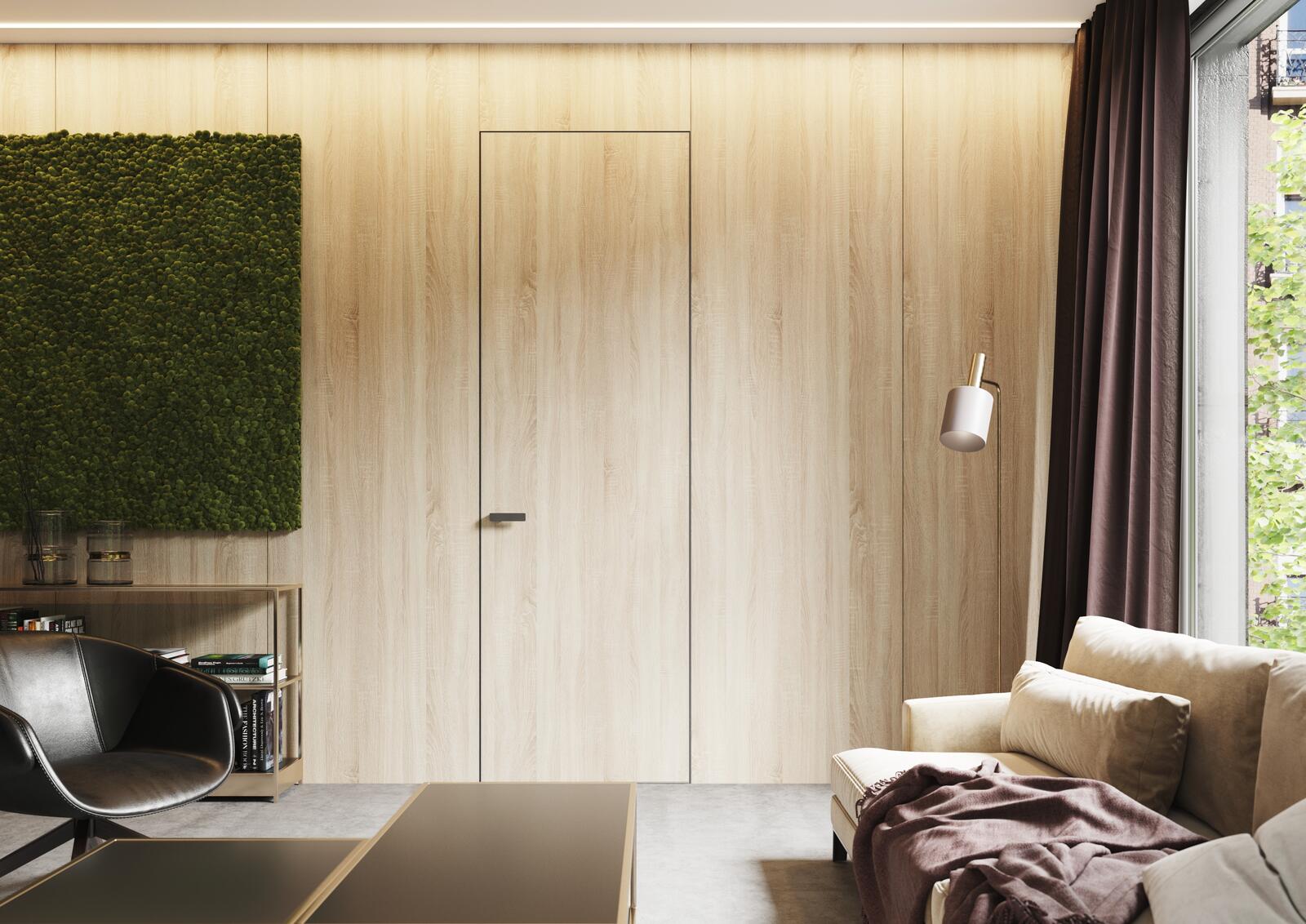 The Efekta 25/15 concealed door frame aligns the hinged door leaf with the wall cladding into one plane of view. The Master 25/15 door leaf can be hung into the Efekta concealed door frame, which allows use of the same surface material as on the wall cladding. A standard wooden door leaf can also be used. This door frame is for reverse opening of the door leaf from the visible matching side.
