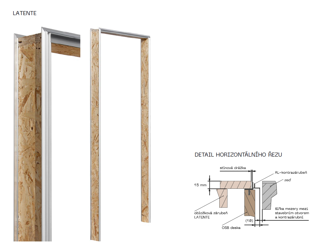 We manufacture “counter door frames”. These are door frames that allow recessing the wooden lining flush with the wall. The wooden lining is supplied by the door manufacturer. The passage around the door is delimited by the door frame, which is flush with the wall. The counter door frame is made of 22 mm thick OSB panels and raw aluminium profile. The Latente door frame is for pull- and push-opening the door from the flush viewing side.