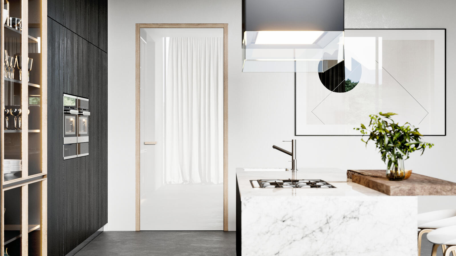 The counter door frame is for non-rebated doors, with a total thickness of 40 mm. Standard for Latente counter door frames is a 50 mm lining with a 12 mm half track and a 2.5 mm shadow groove. The door frame can be used both with drywall and masonry partitions, and we make it in maximum heights of 2,700 mm. Widths are produced for various passages at customer request. For single-leaf and double-leaf doors, the counter door frame is delivered to customers unassembled, and it must be put together before installation. The Latente counter door frame has a 5-year warranty.