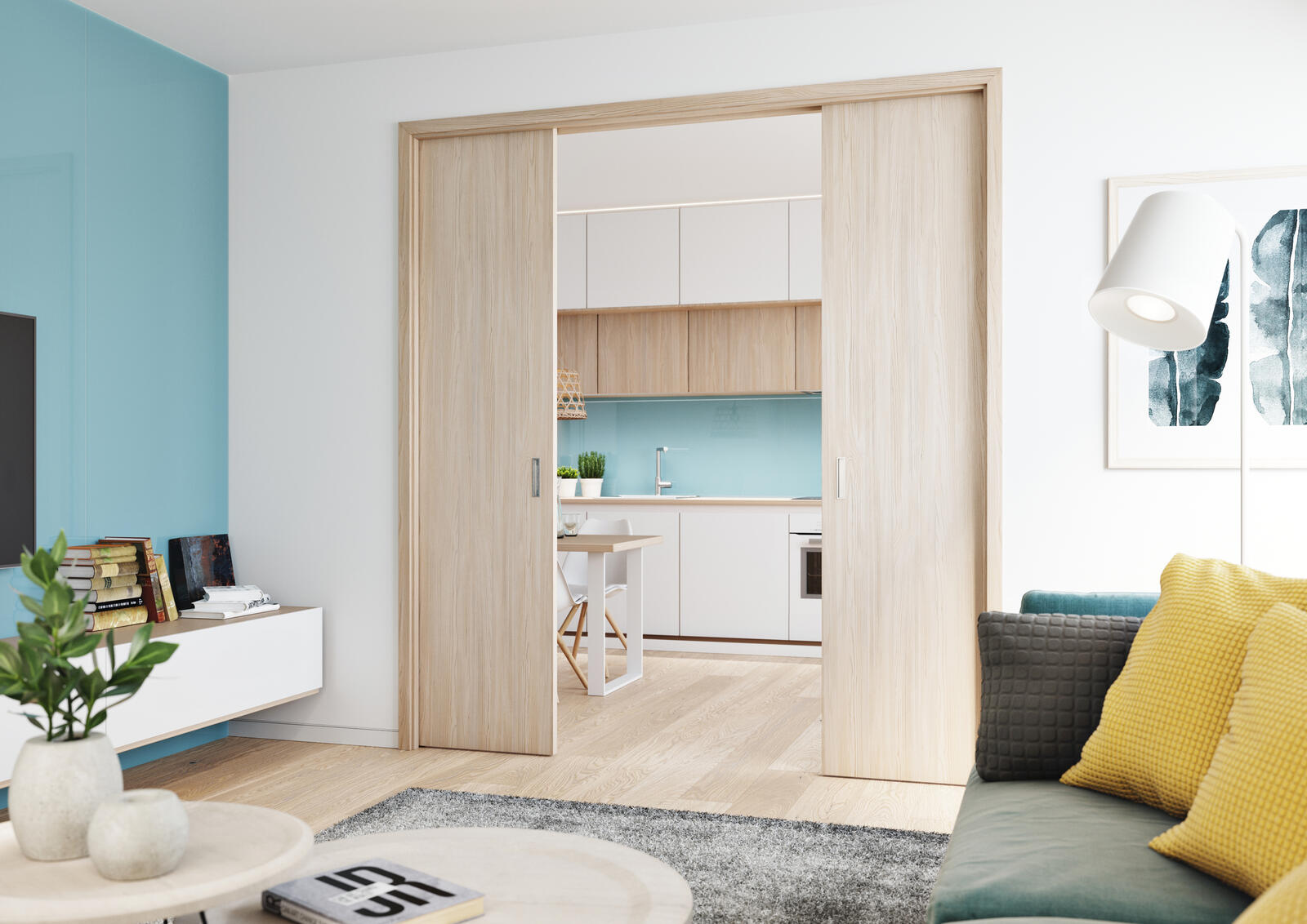 The Norma Komfort pocket door frame is made of two pocket door frames joined by a guide rail. Each of the casings is designed for one single-leaf door. Movement of the leaves can also be synchronized, so both leaves can be opened or closed simultaneously. Norma Komfort offers a solution for large spaces that can be easily joined or separated. For darker spaces there is a glass version of the door that allows maximum entry of sunlight. For darker rooms, a glazed version of the door is available, which allows maximum sunlight in. The Norma Komfort casing is for standard passage heights of 1,970 mm to 2,100 mm, made with a unique wedging method. For custom passage heights, a welded pocket door frame is supplied. For a masonry partition, it is necessary to equip the construction opening with a lintel — the pocket door frame cannot bear a load. The Norma Komfort casing is compatible with all makes of door and is for wooden, all-glass, Master or Idea doors. The entire pocket door frame is made of quality galvanized sheet metal.