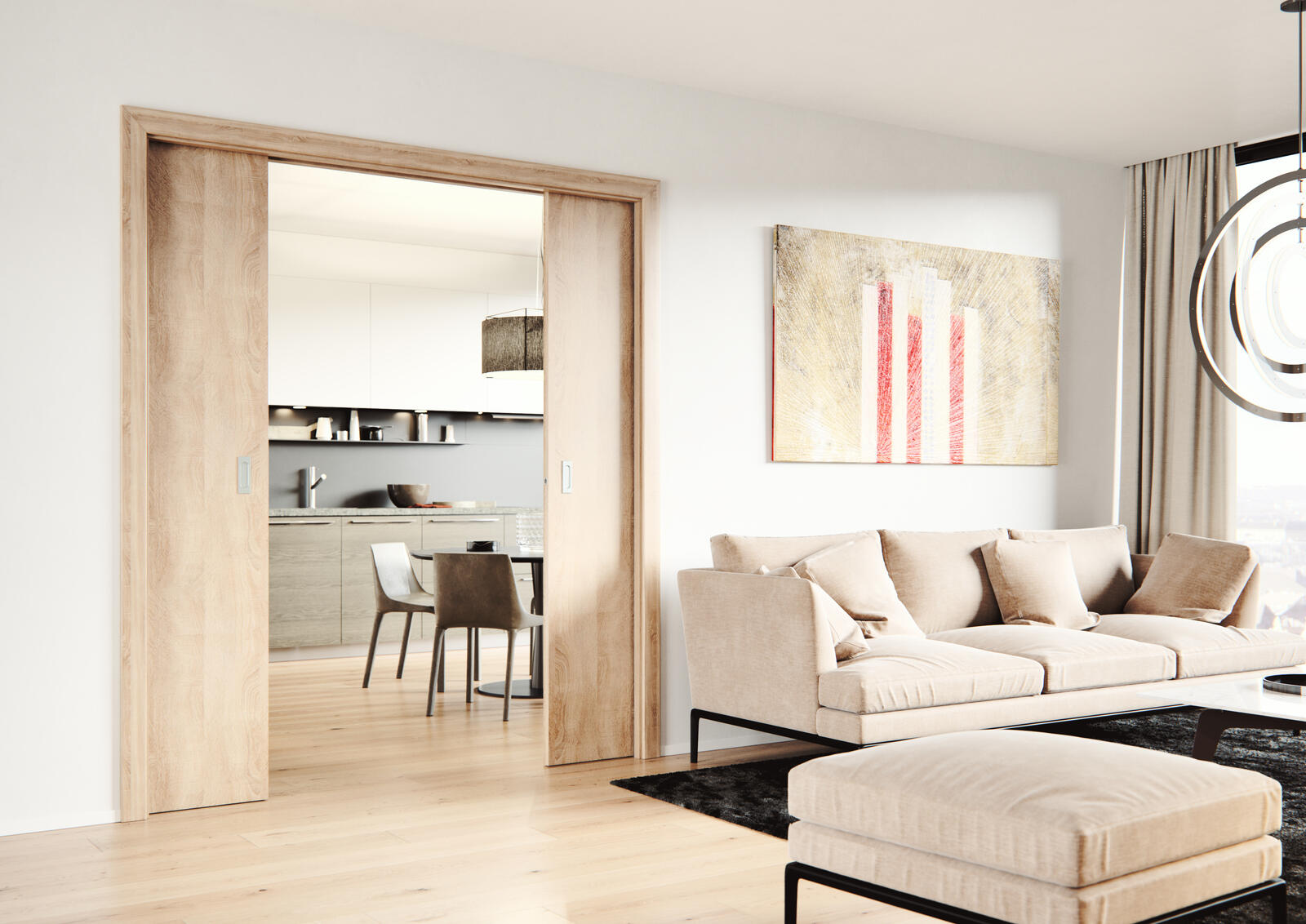Profikit is compatible with all makes of door. It is also suitable for wooden doors, all-glass doors, Master and Idea. The casing’s functionality is exactly like the Norma Komfort pocket door frame — only its lightweight design is different, and it can be installed only in drywall partitions. Put simply, it is a set of two pocket door frames joined together by a guide rail — the doors slide out toward each other. Movement of the door leaves can also be synchronized, so both leaves can be opened or closed simultaneously. The pocket door frame cannot bear a load. The Profikit casing is not available in custom dimensions.