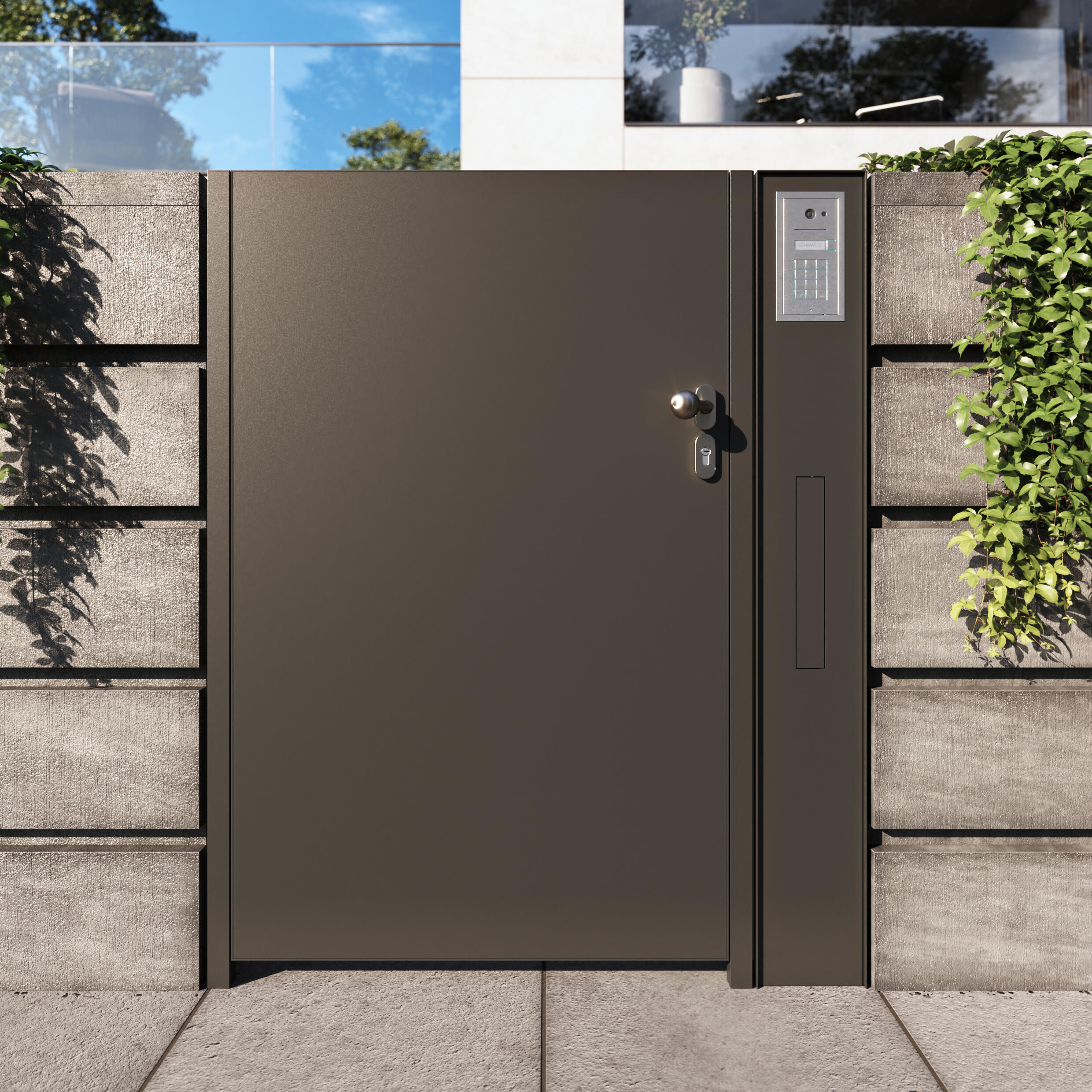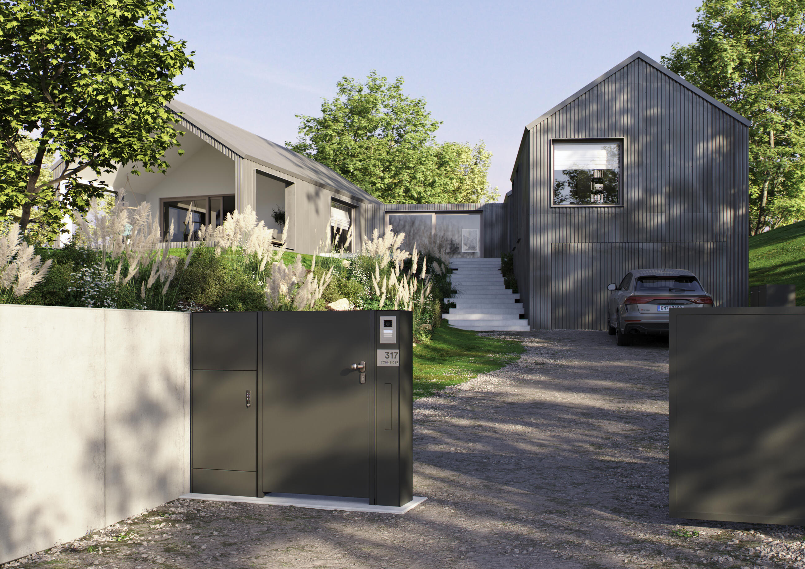 Its design matches the other modules from the LIBERTY system so that the entire fence has a compact and unified look. The gate is available in different sizes and with different types of locks and fittings. It must be anchored into a solid wall/gabion. The Label element can also be used with this version.