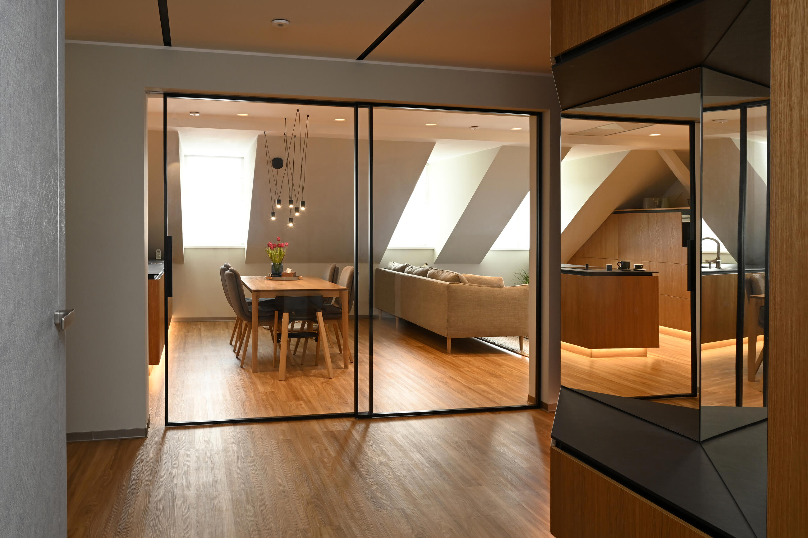 "Our aim was to create a timeless interior design with a uniform ceiling throughout the apartment. At the same time, a sliding glass wall between the hallway and the living room and cladding in the bedroom with a system of variable shelves as well as a wardrobe system, again variable for future modifications, had to be addressed. At first, I was a little put off by the high price of the products and long lead times, but ultimately I was won over by the quality, customer service and discount provided.