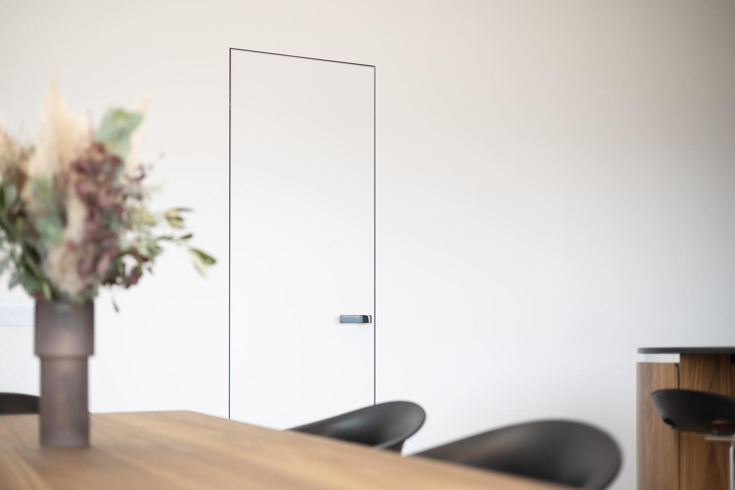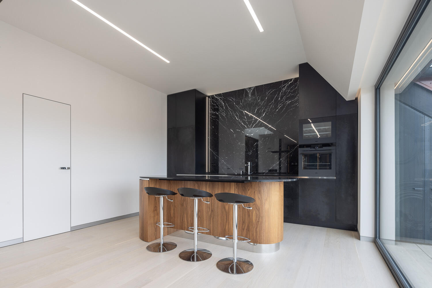 To incorporate the door into the cladded wall, I chose doors and concealed door frames from the Czech company JAP FUTURE. I chose them because of the invisibility effect, as their technical parameters allowed me to use the same cladding as that on the wall. I think that the glass sliding door in the frame, ending the onyx wall on both sides, has been incorporated in a functional way, thus naturally dividing the space into two parts – a private area and living area.