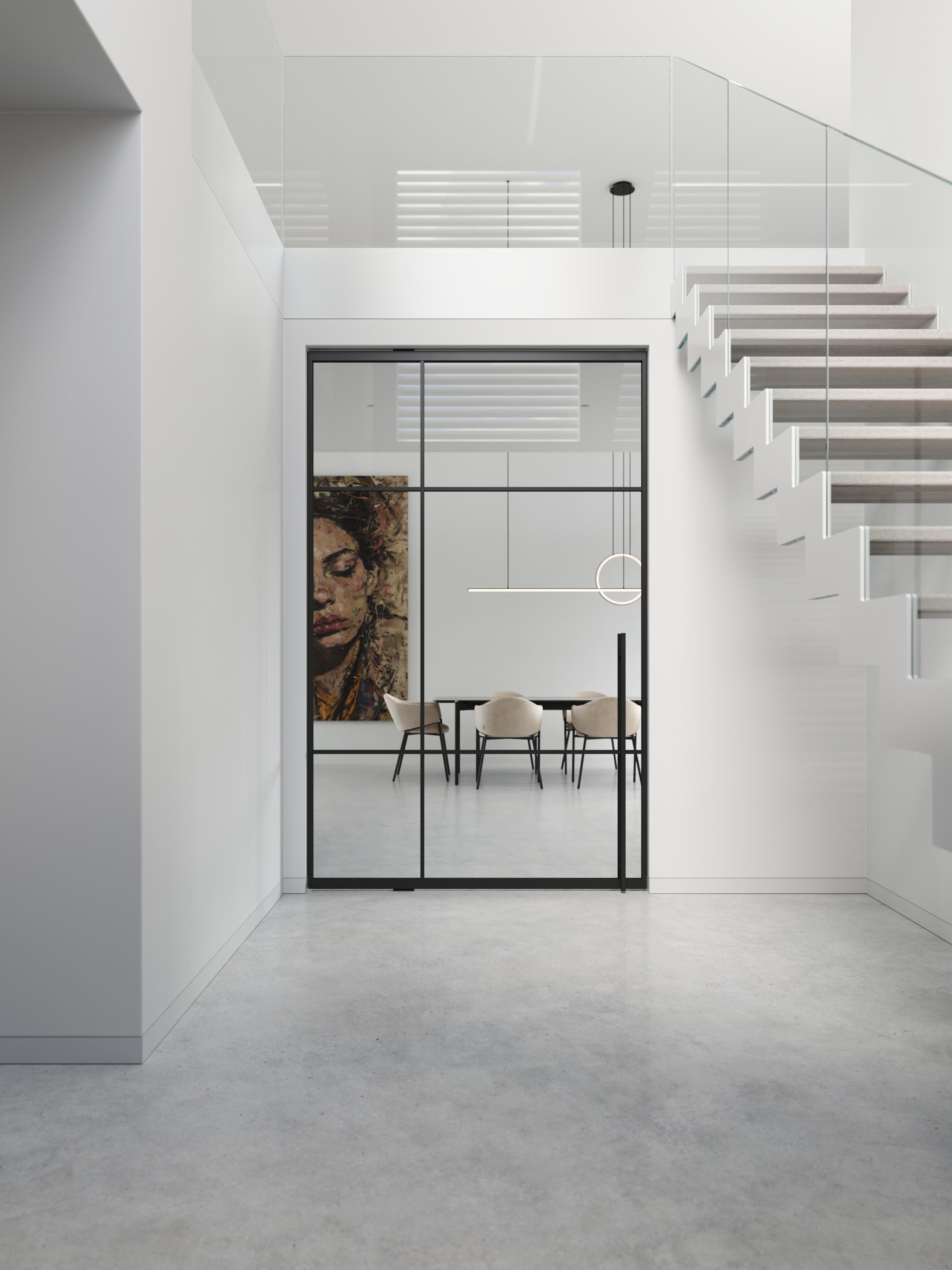 The lightweight design impression comes from the aluminium frame and inner tempered glass, which can be clear, opal, or tinted.