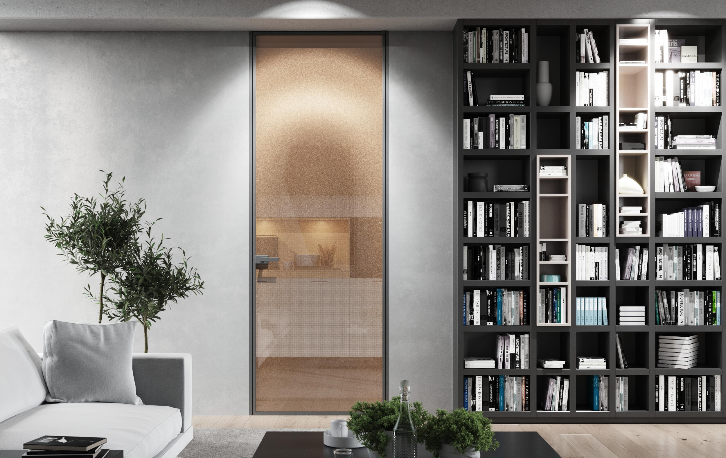 Ideanet interior hinged doors have an aluminium perimeter frame and a glass panel with a laminated metal mesh with a holographic effect. Idea hinged doors can be only single-leaf and without a door header, but with an optional fixed window hole. Idea hinged doors are intended for Garde door frames.