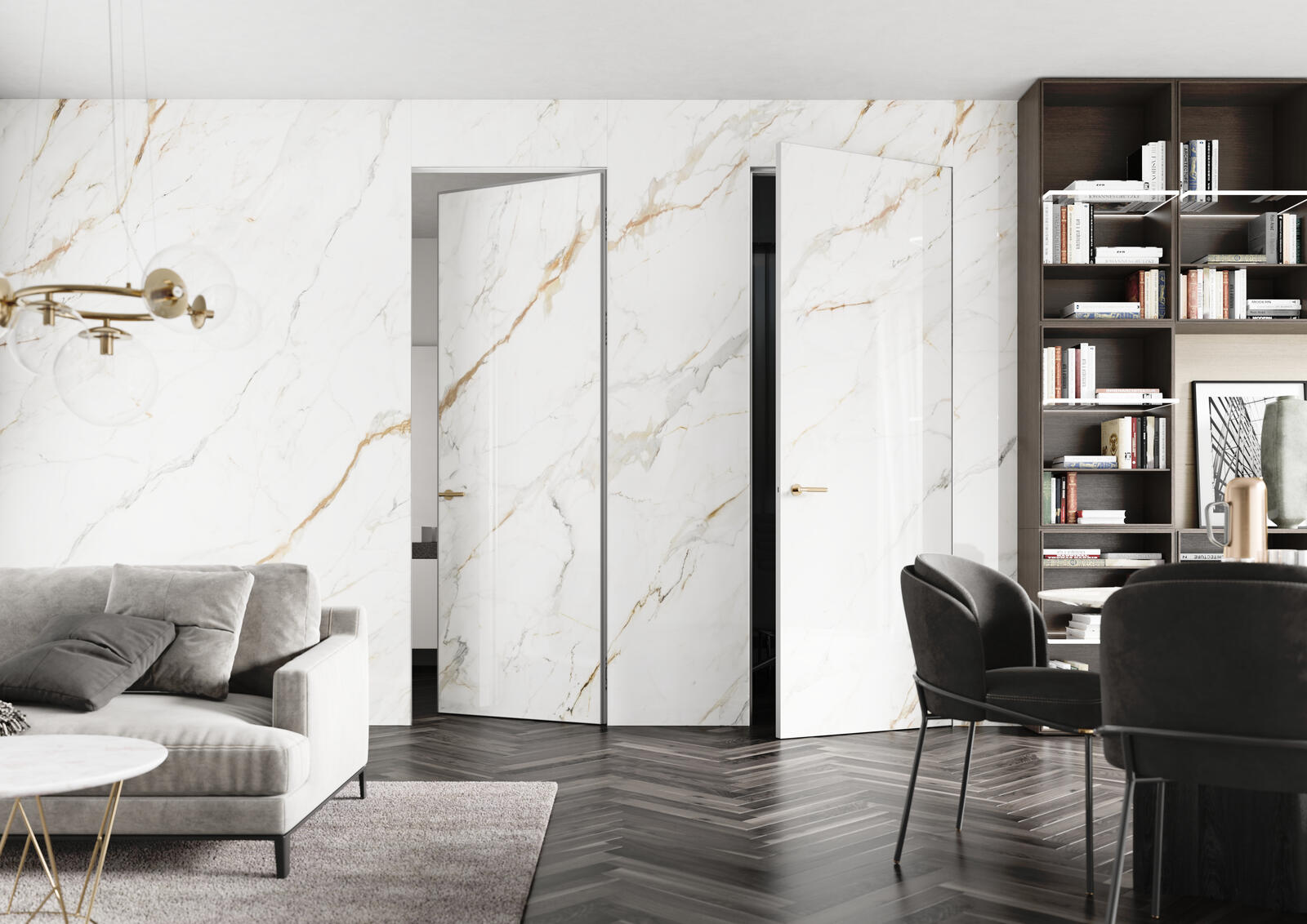 The frame for unique Master doors is made of anodized aluminium profile, which can be sheathed with glass, and MDF panel in a natural, painted or veneer version, a glass with mirror effect, laminates or a magnetic plate. As far as technically possible, we create sheathing based on the customer’s specific request. The inner space between the two claddings is usually filled with extruded polystyrene. We offer Master doors in non-rebated and half-track hinged versions. Fanlight or side window panel option.