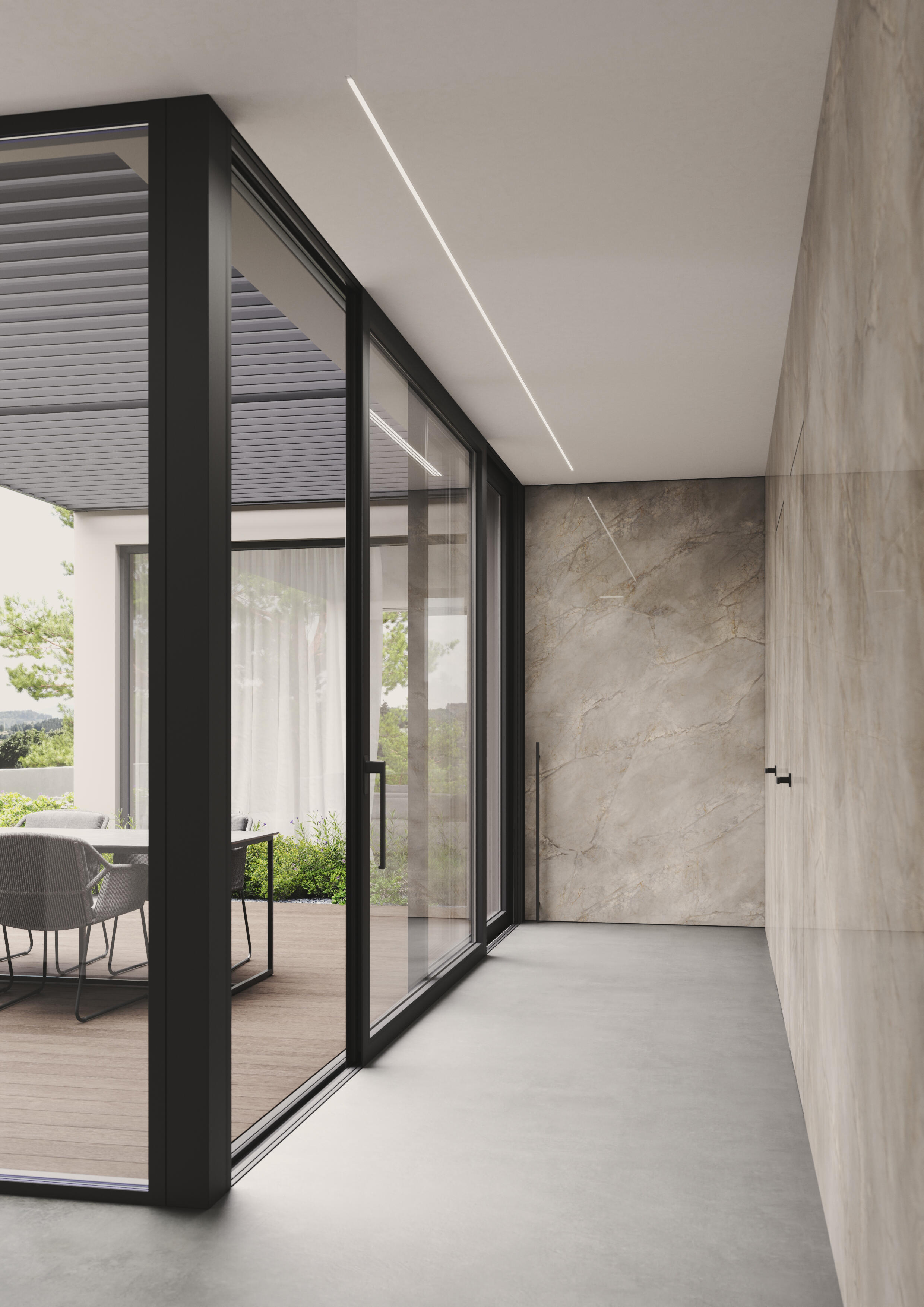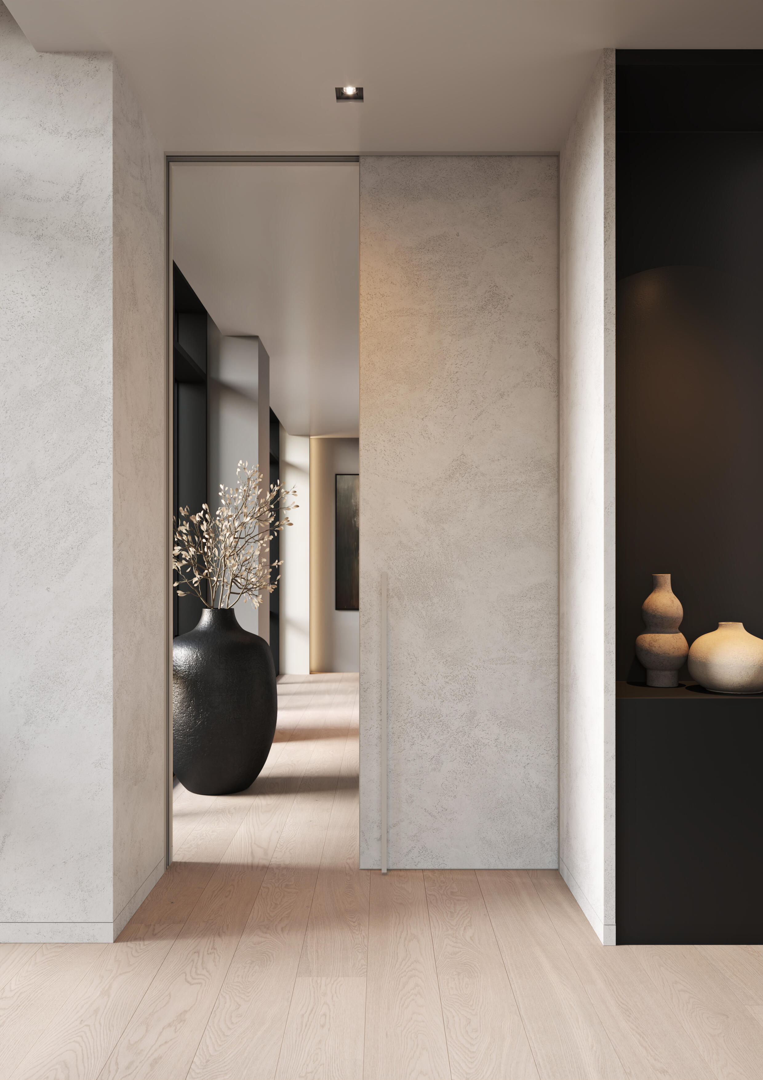 The AKTIVE TITAN pocket frame is a frameless doorframe designed for sliding single-leaf doors of above-standard sizes. It creates a clean passage without a visible architrave and allows for a spacious opening even with truly large door leaves. It is popular in modern interiors where maximizing space and maintaining a minimalist aesthetic are key – in apartments, offices, hotels, and prestigious showrooms. The aluminum frame surface can be matched to the interior in RAL or NCS shades, or finished in JAP METALIC metallic coatings, or with an adhesion primer for seamless wall paint application. The frame is ready for both plasterboard (double sheathing) and masonry walls. For masonry, the wall opening must be fitted with a lintel; for plasterboard structures, UA profiles are required – the frame is not a load-bearing element. Titan is the ideal solution for projects seeking a combination of clean lines, timeless design, and reliability for heavier and larger door leaves (up to 120 kg). The door leaf is not included in the set.