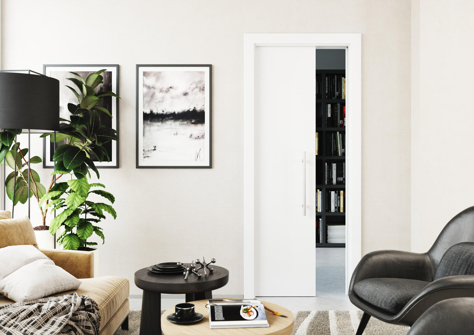 Profikit Standard is compatible with all makes of door. It is suitable for wooden doors, all-glass doors, Master and Idea. The casing’s functionality is exactly like the Norma Standard pocket door frame — only its lightweight design is different, and it can be installed only in drywall partitions. The pocket door frame cannot bear a load. The Profikit casing is not available in custom dimensions.