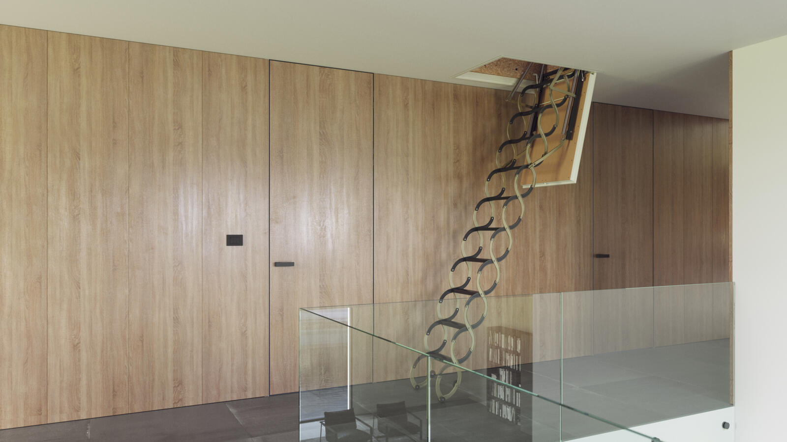 Stairs with sheet-metal sandwich cap built into the ceiling. Cap contains thermal and a flame-resistant insulation. The gap between the cap and frame is sealed with a flame-resistant foam strip. On the frame structure, a folding ladder is fastened to the cap. The whole stair space is closed from above by a thermally insulated cap. From the visible side, the lower cap is painted white and covered with protective film; the wooden parts of the upper cap are protected with a fungicidal solution, and the plywood used is water resistant.