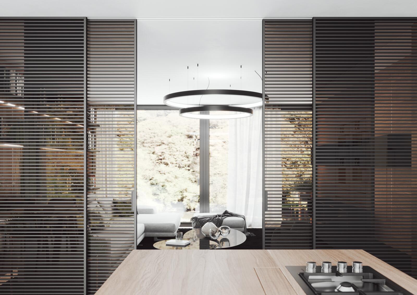 Premium is a designer single- or double-rail aluminium sliding system appropriate for all premium doors from our Idea, Idealine, Ideanet and Master lines, and for wooden doors. Can also be combined with fixed leaves. Sliding doors must have milled fixtures in their upper frame, which are used to hang the doors for sliding carriages. The sliding door is guided on the floor with a guide pin. To damp both sides, two single-sided door stops must be used.