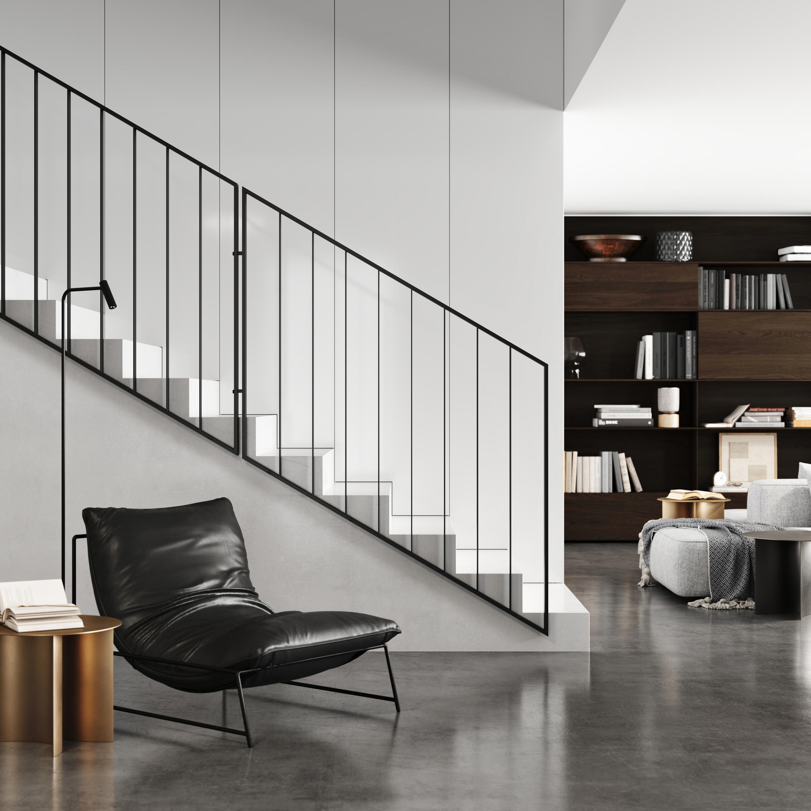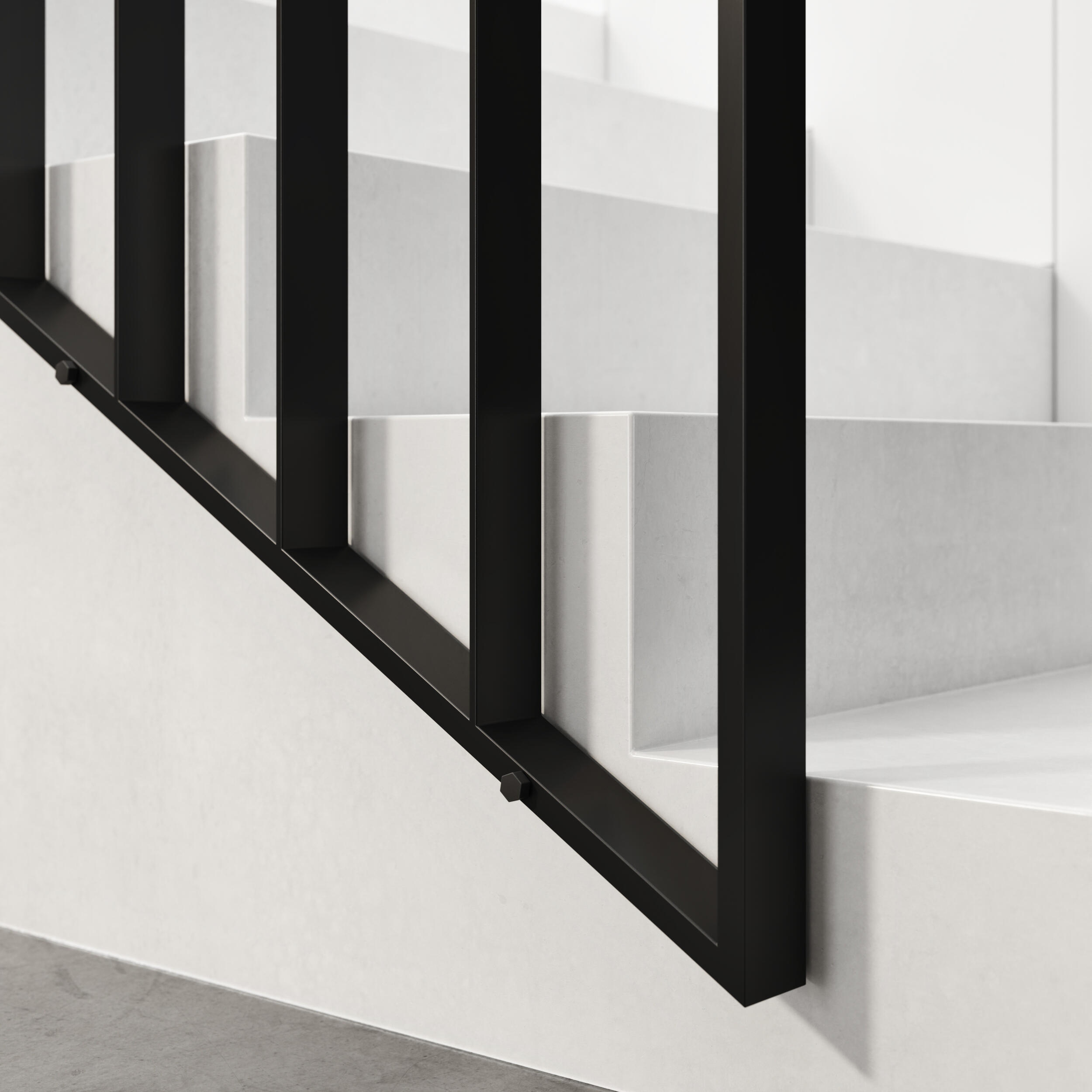 The BLADE interior railing has a basic structure consisting of a steel frame and a flat vertical steel strip infill. The choice of individual material dimensions allows for design flexibility. There are two ways of anchoring the railing. Either on the side of the staircase or on columns placed on top of the steps. The BLADE model is available in colours according to the customer’s requirements or in stainless steel.