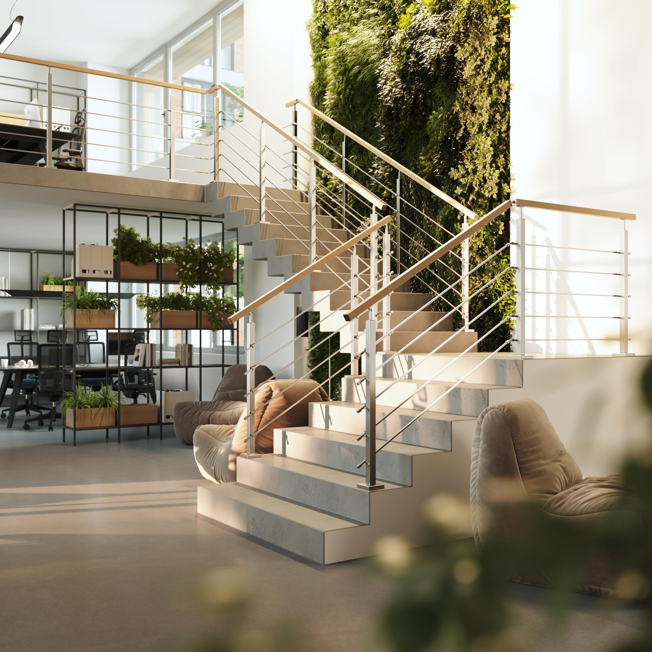 Alternatively, the handle can be made of wood. Stainless steel feet are anchored to the steps from above. For the SQUARE model, we also produce the columns and the handle in colour shades according to the customer’s requirements; the rods remain in stainless steel.