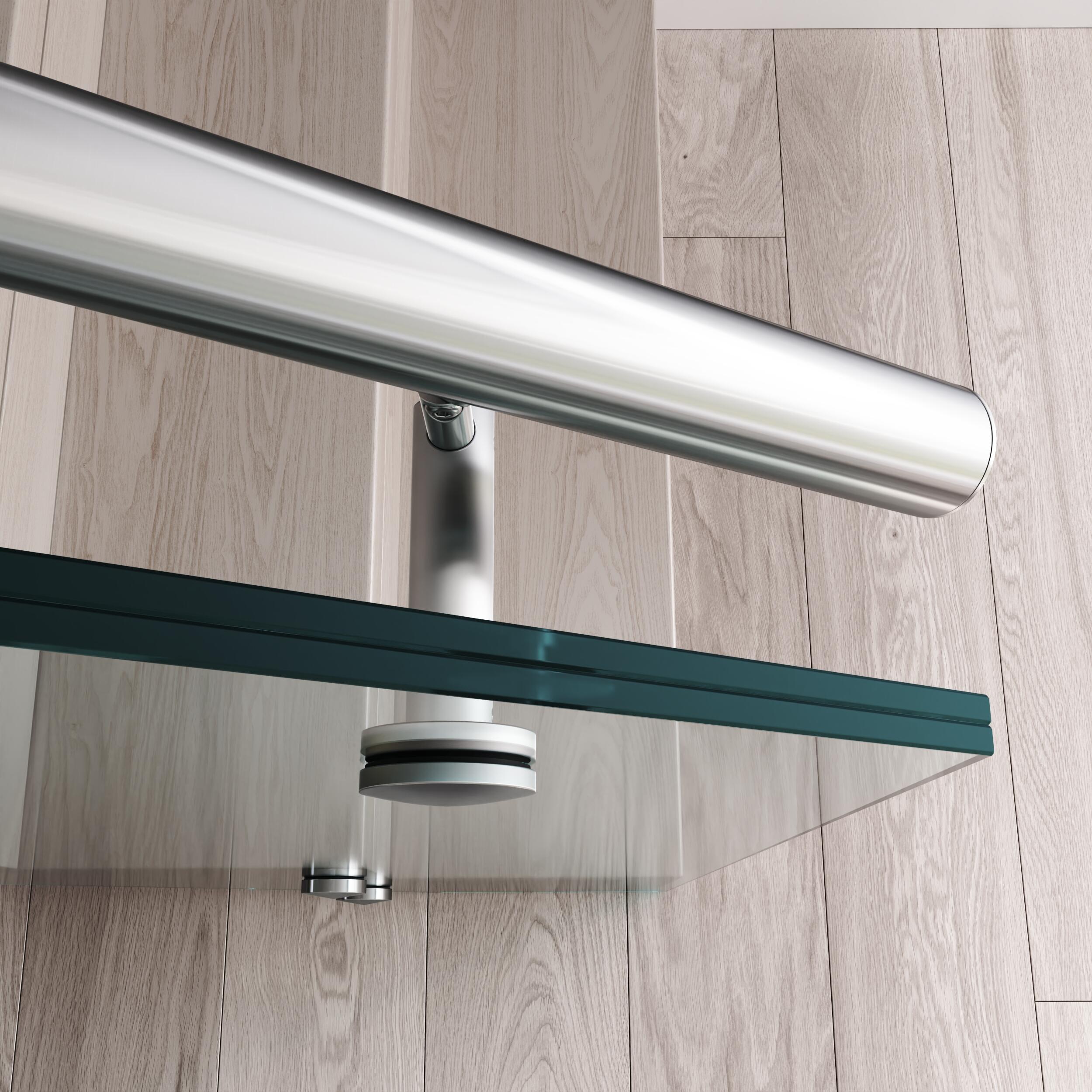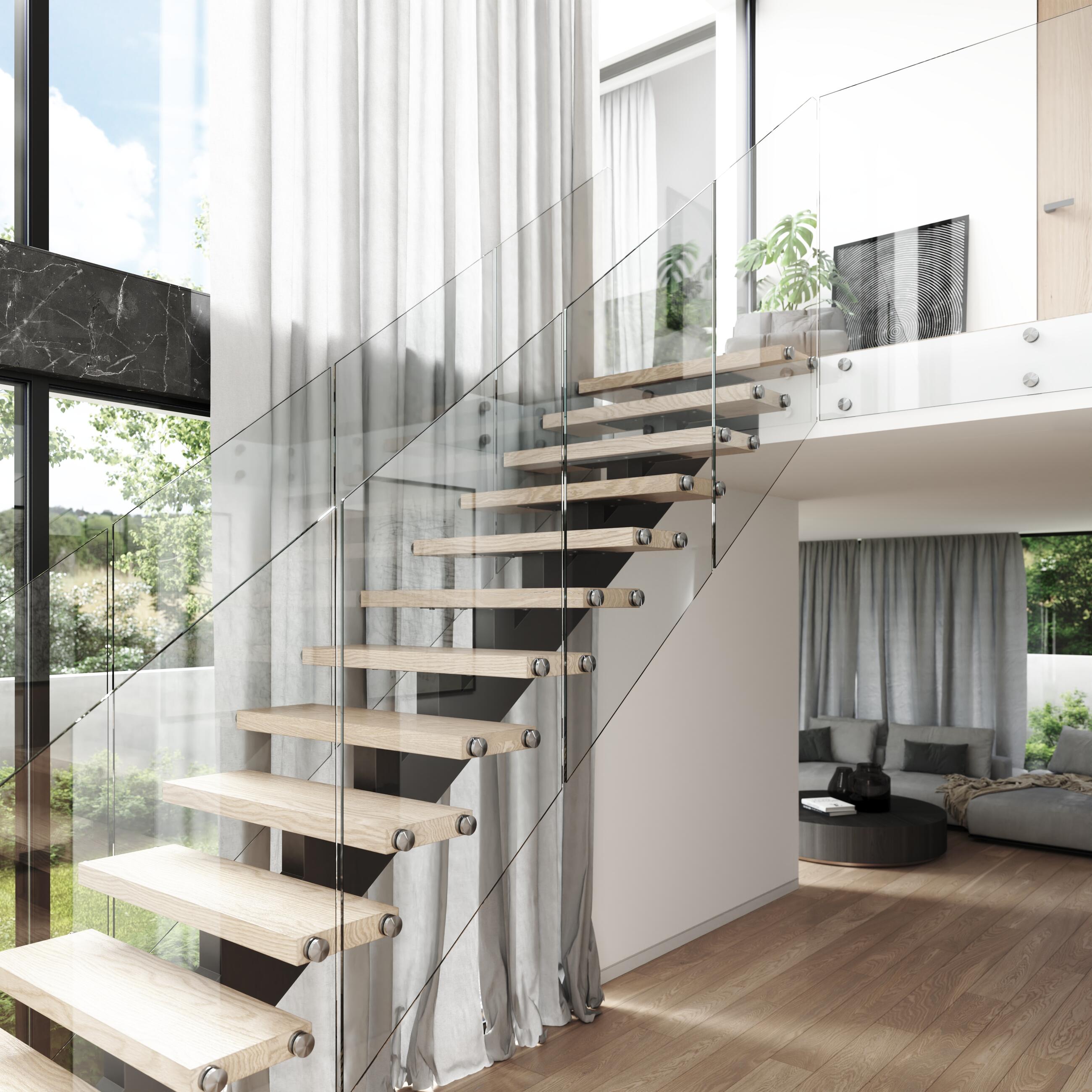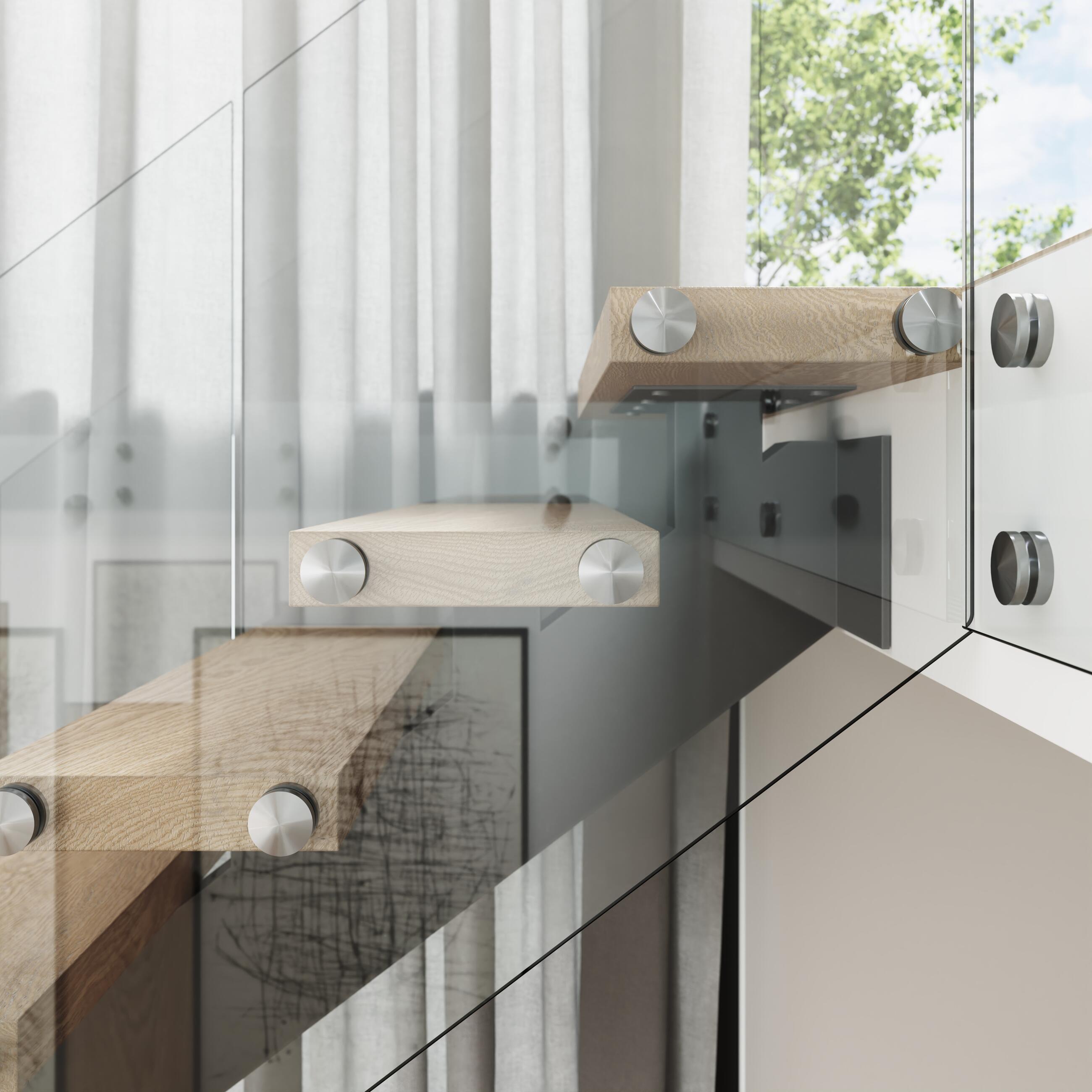 The all-glass railing should be supplemented with a handle that can be placed directly on the glass from above or on the bevelled necks. It is advisable to protect the glass edge against damage with a cover "U" profile. The handle, cover profile and pucks of the TRANSPARENT model are also available in RAL shades according to the customer’s requirements. The TRANSPARENT interior railing has a basic structure consisting of a pair of glued tempered glass panels anchored to the side of the staircase on stainless steel pucks.