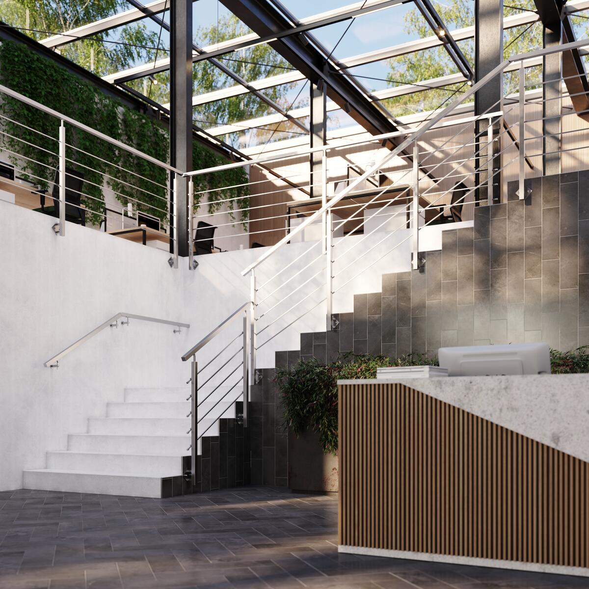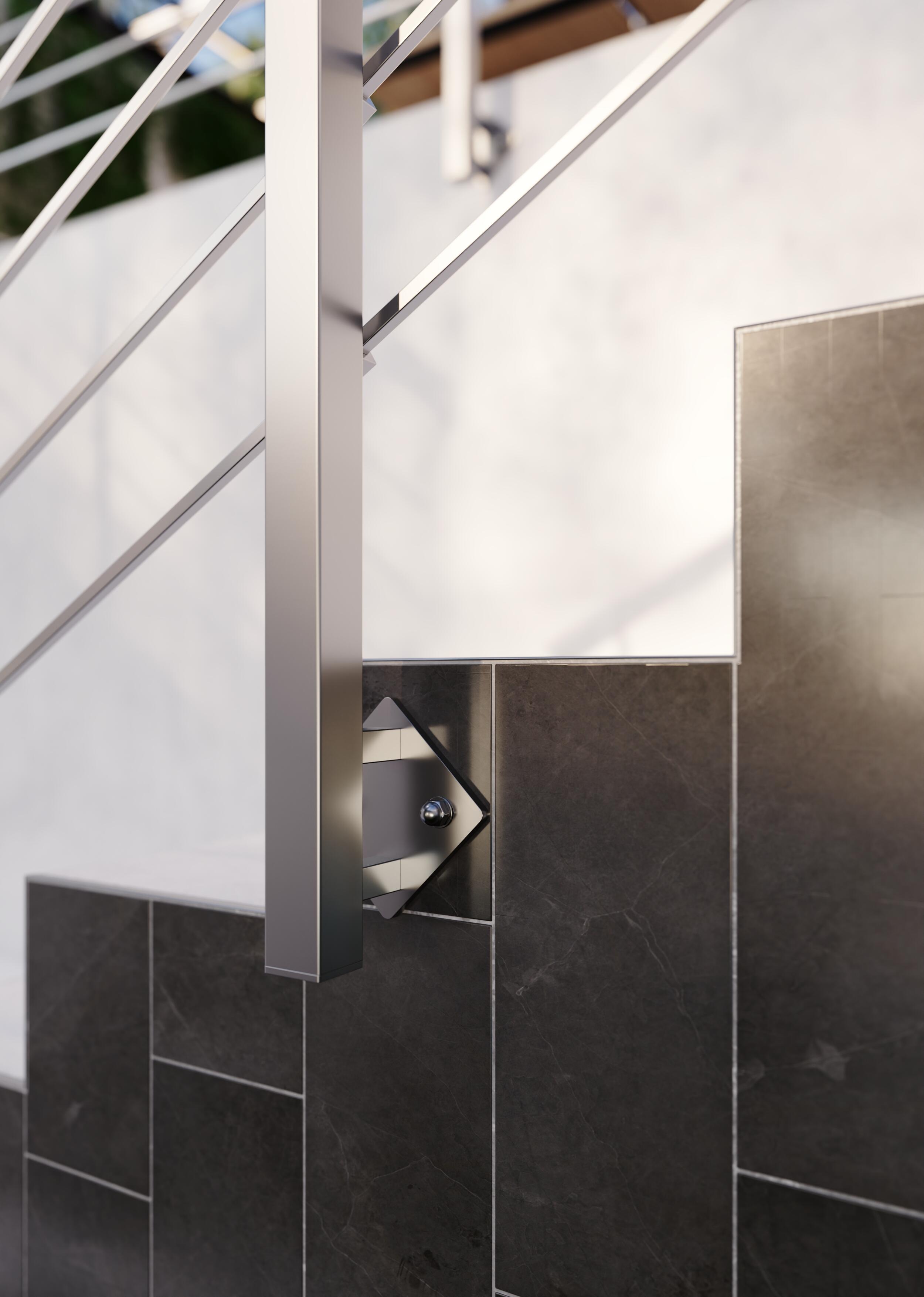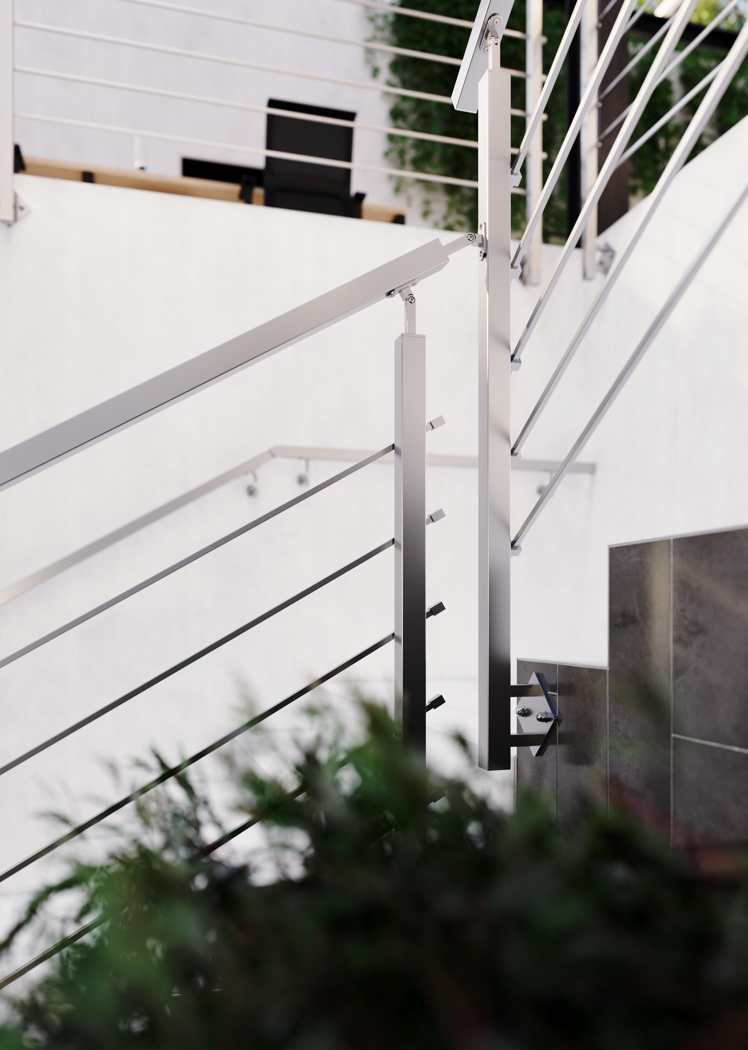 The USE exterior/interior railing has a basic structure consisting of square columns, square horizontal bar infill and a stainless steel handle. The wooden handles can only be indoors; we do not put wooden handles outdoors. Stainless steel feet are anchored from the side of the staircase. For the USE model, we also produce the columns and the handle in RAL colour shades according to the customer’s requirements; the rods remain in stainless steel.