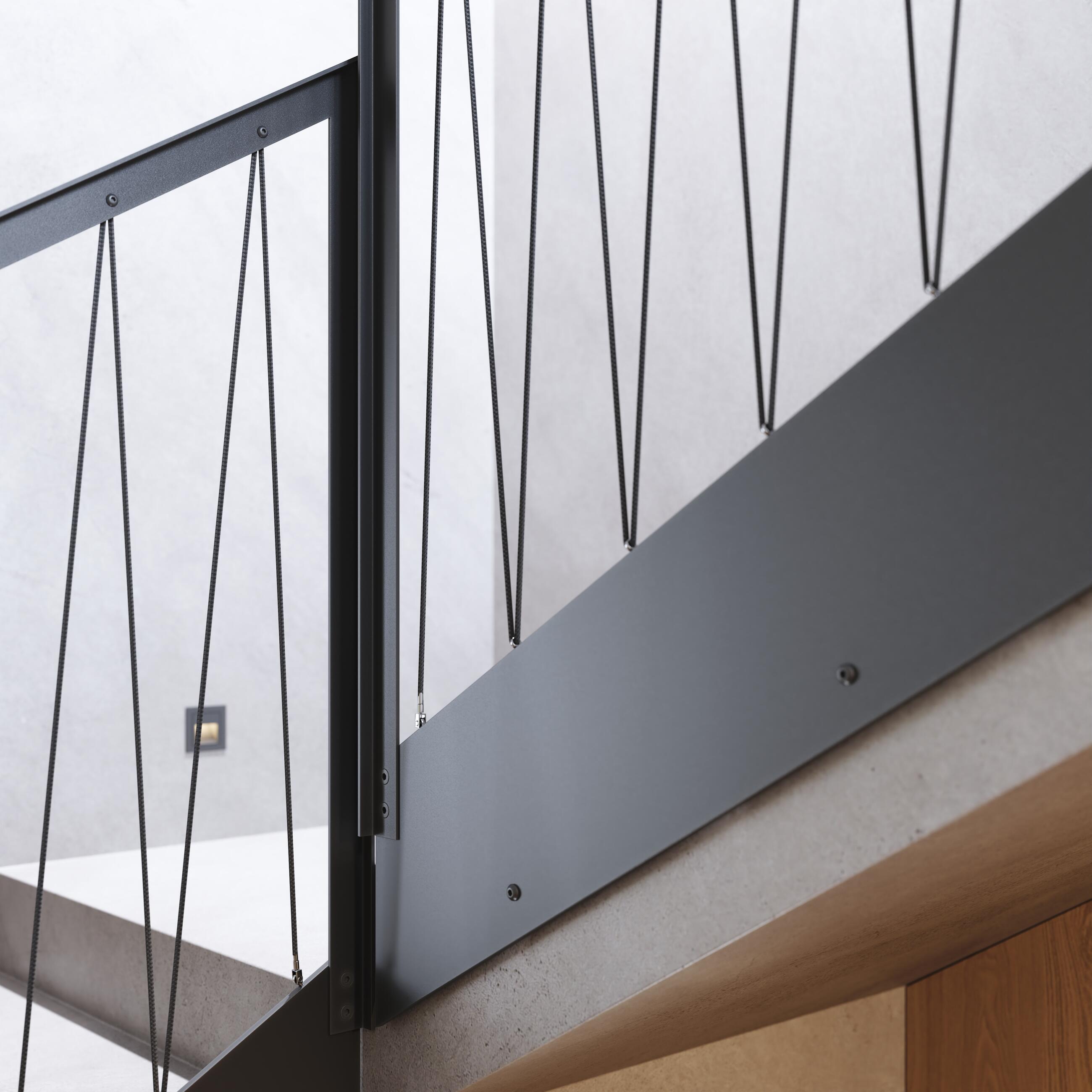 The ZIG ZAG interior railing has a basic structure consisting of a steel frame and an infill of stainless steel cables led through eyelets. The choice of individual material dimensions allows for design flexibility. There are two ways of anchoring the railing. Either on the side of the staircase or on columns placed on top of the steps. The ZIG ZAG model is available in colours according to the customer’s requirements or in stainless steel. Stainless steel cables and eyelets remain uncoated.